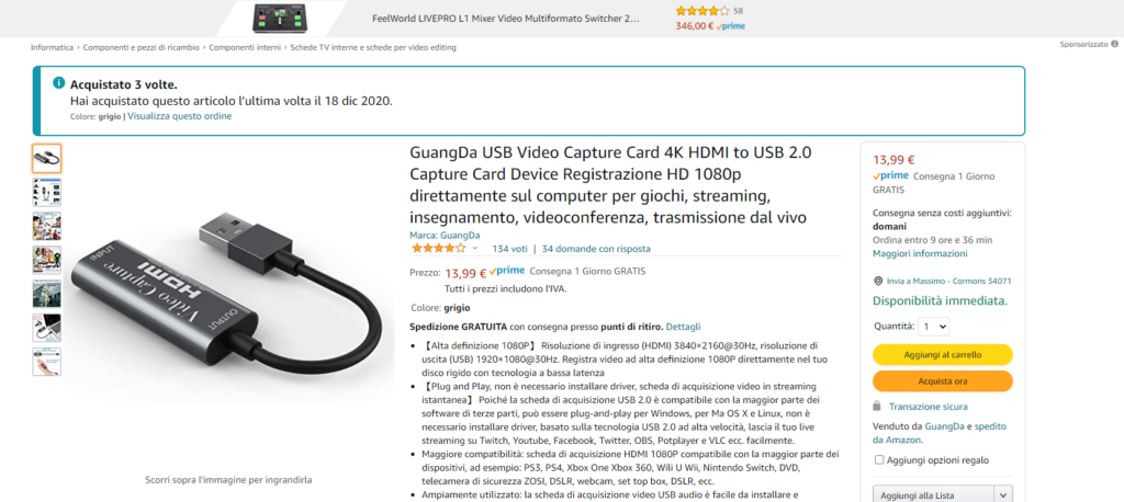Mi preme sottolineare che online troverete diversi modelli che alla vista si somigliano pure. Nel mio caso ho testato le GuangDa USB Video Capture Card 4K HDMI to USB 2.0 e non altre, quindi ovviamente non posso mettere la mano sul fuoco in merito al fatto che tutti i modelli funzionino correttamente.